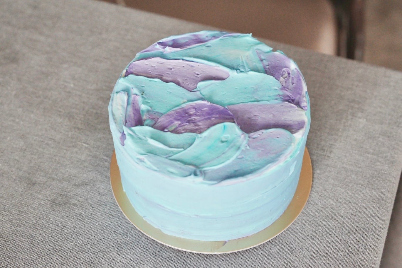 カステラのようなスポンジにシロップを染み込ませ、季節のフルーツとクリームをサンドし、水色/紫のクリームで作る華やかなケーキ。